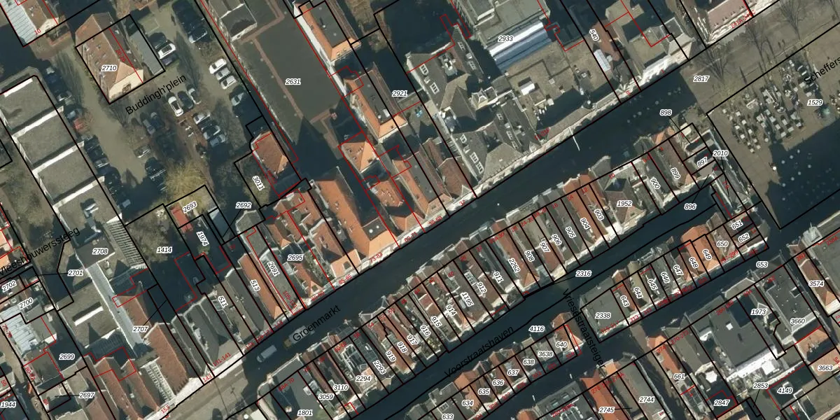 Het perceel waarop Groenmarkt 53 staat heeft een oppervlakte van 1858 m². Dit is een zeer groot perceel. De perceeloppervlakte wordt geregistreerd door het Kadaster. Gedetailleerde informatie over de maten van dit perceel kunt u vinden in het rapport Kadastrale kaart met maatvoering van Groenmarkt 53.