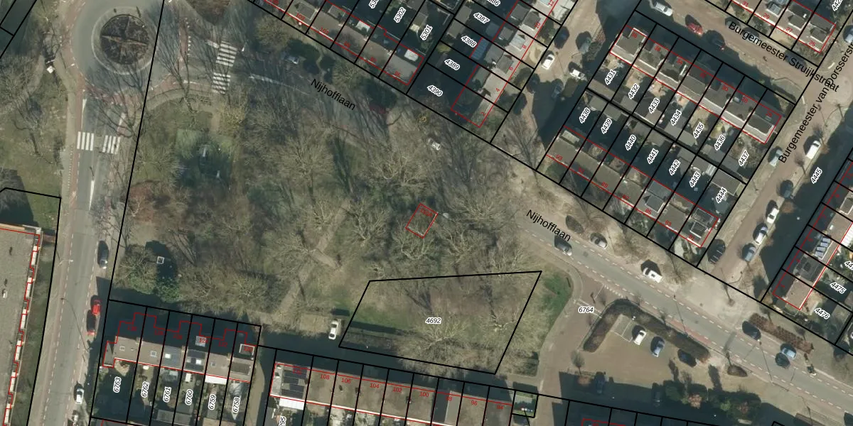 Het perceel waarop Nijhofflaan 110-A staat heeft een oppervlakte van 9900 m². Dit is een zeer groot perceel. De perceeloppervlakte wordt geregistreerd door het Kadaster. Gedetailleerde informatie over de maten van dit perceel kunt u vinden in het rapport Kadastrale kaart met maatvoering van Nijhofflaan 110-A.