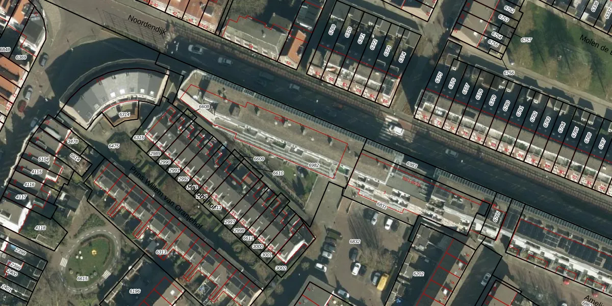 Het perceel waarop Noordendijk 65 staat heeft een oppervlakte van 1469 m². Dit is een zeer groot perceel. De perceeloppervlakte wordt geregistreerd door het Kadaster. Gedetailleerde informatie over de maten van dit perceel kunt u vinden in het rapport Kadastrale kaart met maatvoering van Noordendijk 65.