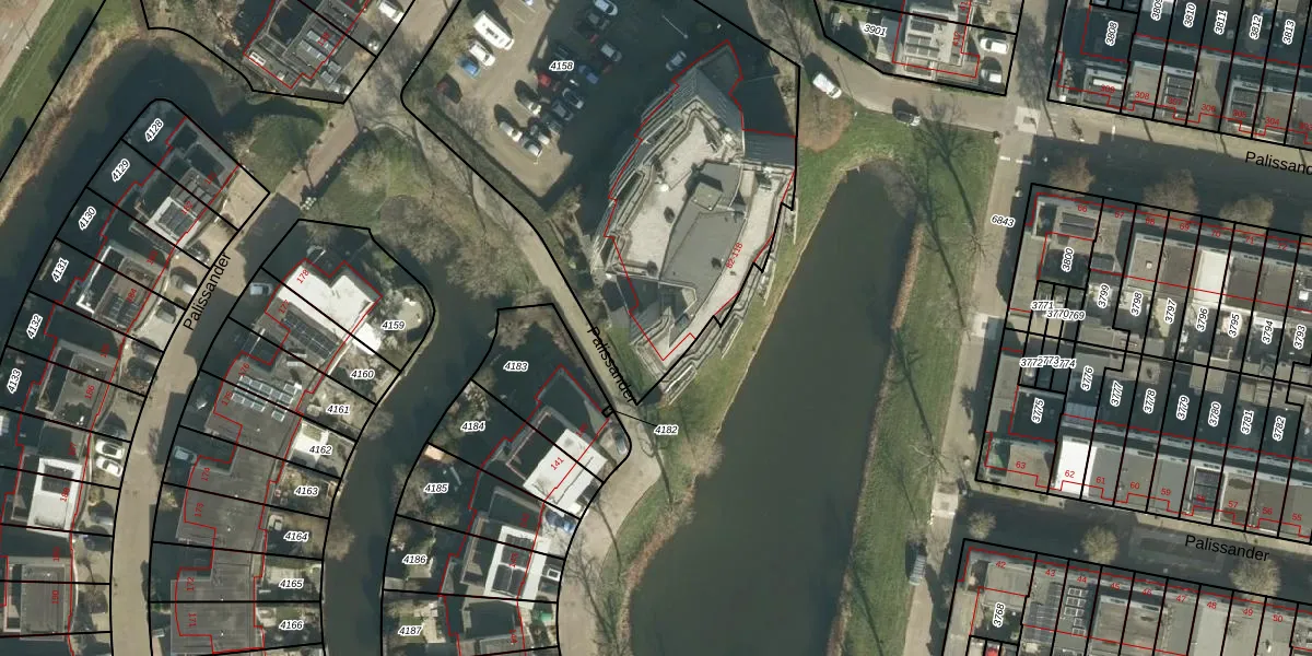 Het perceel waarop Palissander 104 staat heeft een oppervlakte van 2580 m². Dit is een zeer groot perceel. De perceeloppervlakte wordt geregistreerd door het Kadaster. Gedetailleerde informatie over de maten van dit perceel kunt u vinden in het rapport Kadastrale kaart met maatvoering van Palissander 104.