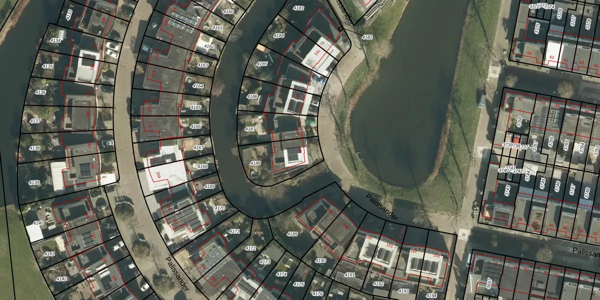Het perceel waarop Palissander 145 staat heeft een oppervlakte van 327 m². Dit is een groot perceel. De perceeloppervlakte wordt geregistreerd door het Kadaster. Gedetailleerde informatie over de maten van dit perceel kunt u vinden in het rapport Kadastrale kaart met maatvoering van Palissander 145.