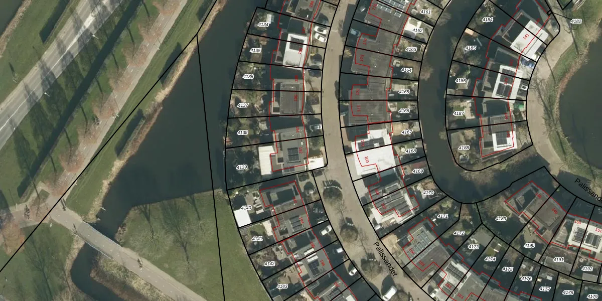 Het perceel waarop Palissander 192 staat heeft een oppervlakte van 406 m². Dit is een groot perceel. De perceeloppervlakte wordt geregistreerd door het Kadaster. Gedetailleerde informatie over de maten van dit perceel kunt u vinden in het rapport Kadastrale kaart met maatvoering van Palissander 192.