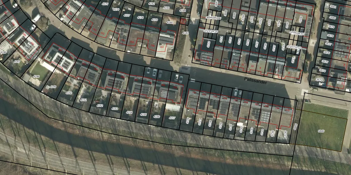 Het perceel waarop Palissander 210 staat heeft een oppervlakte van 329 m². Dit is een groot perceel. De perceeloppervlakte wordt geregistreerd door het Kadaster. Gedetailleerde informatie over de maten van dit perceel kunt u vinden in het rapport Kadastrale kaart met maatvoering van Palissander 210.