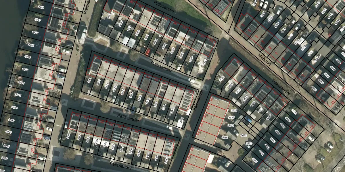 Het perceel waarop Palissander 355 staat heeft een oppervlakte van 124 m². Dit is een middelgroot perceel. De perceeloppervlakte wordt geregistreerd door het Kadaster. Gedetailleerde informatie over de maten van dit perceel kunt u vinden in het rapport Kadastrale kaart met maatvoering van Palissander 355.