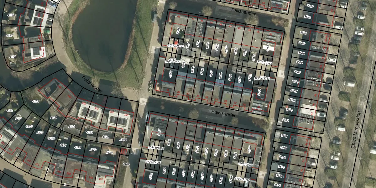 Het perceel waarop Palissander 37 staat heeft een oppervlakte van 111 m². Dit is een middelgroot perceel. De perceeloppervlakte wordt geregistreerd door het Kadaster. Gedetailleerde informatie over de maten van dit perceel kunt u vinden in het rapport Kadastrale kaart met maatvoering van Palissander 37.