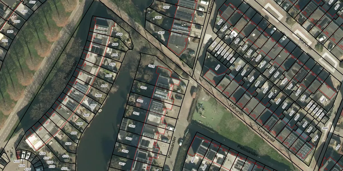 Het perceel waarop Palissander 389 staat heeft een oppervlakte van 409 m². Dit is een groot perceel. De perceeloppervlakte wordt geregistreerd door het Kadaster. Gedetailleerde informatie over de maten van dit perceel kunt u vinden in het rapport Kadastrale kaart met maatvoering van Palissander 389.