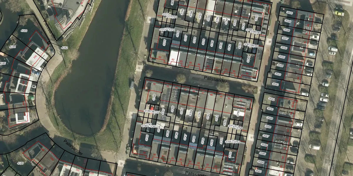 Het perceel waarop Palissander 44 staat heeft een oppervlakte van 107 m². Dit is een middelgroot perceel. De perceeloppervlakte wordt geregistreerd door het Kadaster. Gedetailleerde informatie over de maten van dit perceel kunt u vinden in het rapport Kadastrale kaart met maatvoering van Palissander 44.