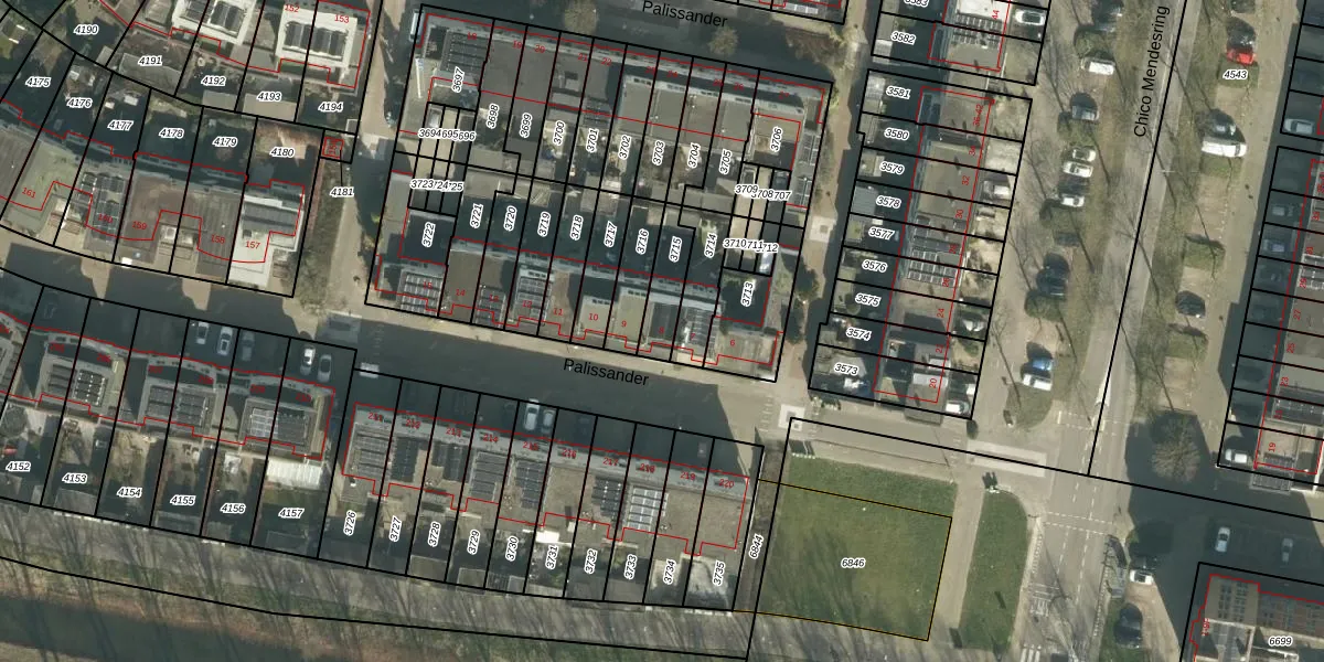 Het perceel waarop Palissander 8 staat heeft een oppervlakte van 111 m². Dit is een middelgroot perceel. De perceeloppervlakte wordt geregistreerd door het Kadaster. Gedetailleerde informatie over de maten van dit perceel kunt u vinden in het rapport Kadastrale kaart met maatvoering van Palissander 8.