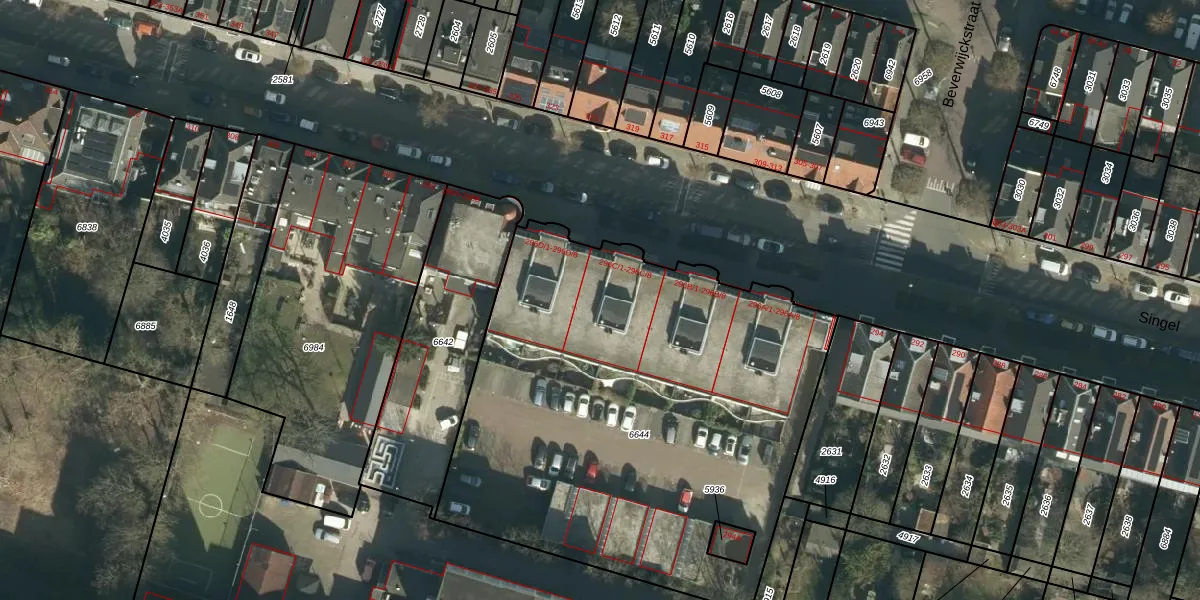 Het perceel waarop Singel 296-C-5 staat heeft een oppervlakte van 2856 m². Dit is een zeer groot perceel. De perceeloppervlakte wordt geregistreerd door het Kadaster. Gedetailleerde informatie over de maten van dit perceel kunt u vinden in het rapport Kadastrale kaart met maatvoering van Singel 296-C-5.