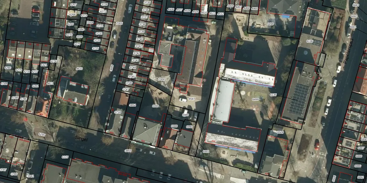 Het perceel waarop Singel 443 staat heeft een oppervlakte van 1512 m². Dit is een zeer groot perceel. De perceeloppervlakte wordt geregistreerd door het Kadaster. Gedetailleerde informatie over de maten van dit perceel kunt u vinden in het rapport Kadastrale kaart met maatvoering van Singel 443.