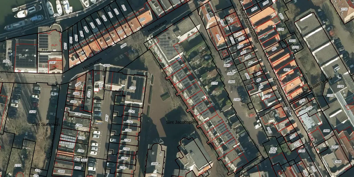 Het perceel waarop Sint Jacobsplein 13 staat heeft een oppervlakte van 2190 m². Dit is een zeer groot perceel. De perceeloppervlakte wordt geregistreerd door het Kadaster. Gedetailleerde informatie over de maten van dit perceel kunt u vinden in het rapport Kadastrale kaart met maatvoering van Sint Jacobsplein 13.