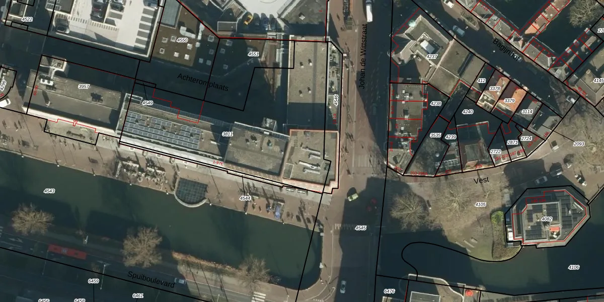 Het perceel waarop Spuiboulevard 39 staat heeft een oppervlakte van 1915 m². Dit is een zeer groot perceel. De perceeloppervlakte wordt geregistreerd door het Kadaster. Gedetailleerde informatie over de maten van dit perceel kunt u vinden in het rapport Kadastrale kaart met maatvoering van Spuiboulevard 39.