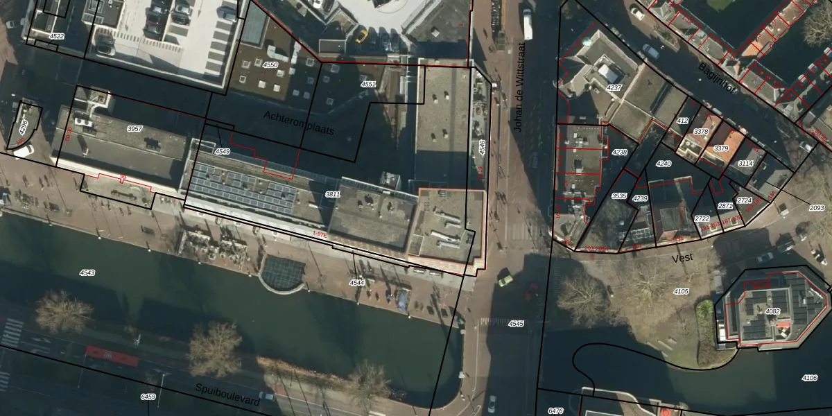 Het perceel waarop Spuiboulevard 43 staat heeft een oppervlakte van 1915 m². Dit is een zeer groot perceel. De perceeloppervlakte wordt geregistreerd door het Kadaster. Gedetailleerde informatie over de maten van dit perceel kunt u vinden in het rapport Kadastrale kaart met maatvoering van Spuiboulevard 43.