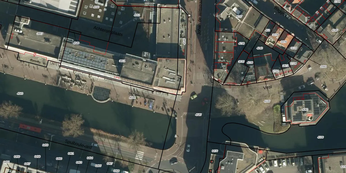 Het perceel waarop Spuiboulevard 45 staat heeft een oppervlakte van 1915 m². Dit is een zeer groot perceel. De perceeloppervlakte wordt geregistreerd door het Kadaster. Gedetailleerde informatie over de maten van dit perceel kunt u vinden in het rapport Kadastrale kaart met maatvoering van Spuiboulevard 45.