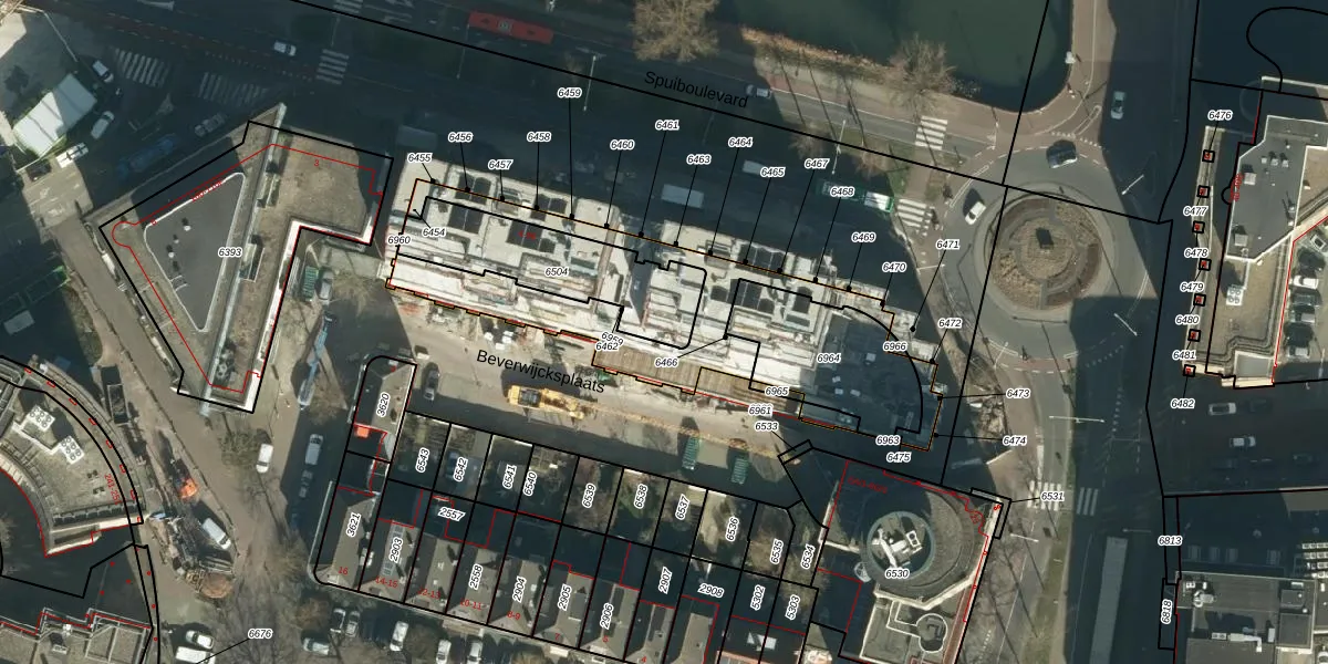 Het perceel waarop Spuiboulevard 46 staat heeft een oppervlakte van 439 m². Dit is een groot perceel. De perceeloppervlakte wordt geregistreerd door het Kadaster. Gedetailleerde informatie over de maten van dit perceel kunt u vinden in het rapport Kadastrale kaart met maatvoering van Spuiboulevard 46.