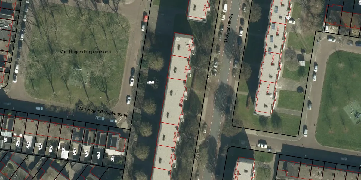 Het perceel waarop Thorbeckeweg 99 staat heeft een oppervlakte van 6240 m². Dit is een zeer groot perceel. De perceeloppervlakte wordt geregistreerd door het Kadaster. Gedetailleerde informatie over de maten van dit perceel kunt u vinden in het rapport Kadastrale kaart met maatvoering van Thorbeckeweg 99.