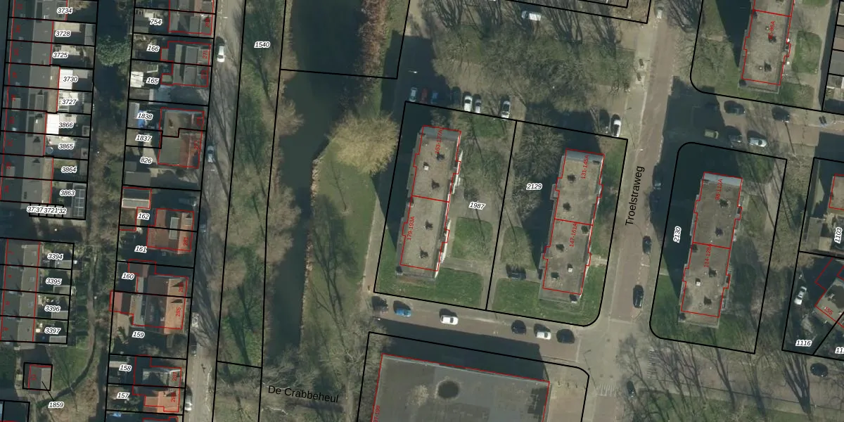 Het perceel waarop Troelstraweg 193 staat heeft een oppervlakte van 1215 m². Dit is een zeer groot perceel. De perceeloppervlakte wordt geregistreerd door het Kadaster. Gedetailleerde informatie over de maten van dit perceel kunt u vinden in het rapport Kadastrale kaart met maatvoering van Troelstraweg 193.