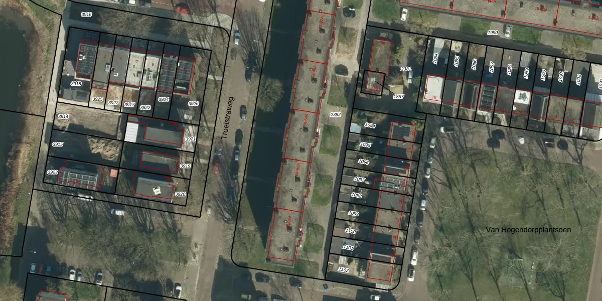 Het perceel waarop Troelstraweg 64-A staat heeft een oppervlakte van 3485 m². Dit is een zeer groot perceel. De perceeloppervlakte wordt geregistreerd door het Kadaster. Gedetailleerde informatie over de maten van dit perceel kunt u vinden in het rapport Kadastrale kaart met maatvoering van Troelstraweg 64-A.