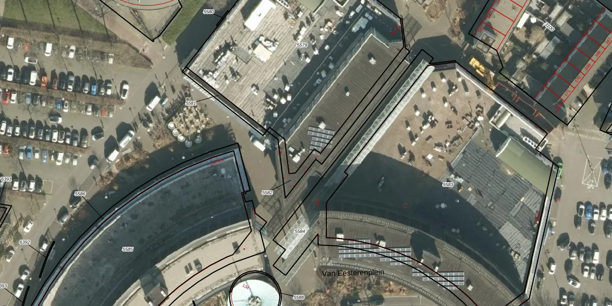 Het perceel waarop Van Eesterenplein 105 staat heeft een oppervlakte van 2850 m². Dit is een zeer groot perceel. De perceeloppervlakte wordt geregistreerd door het Kadaster. Gedetailleerde informatie over de maten van dit perceel kunt u vinden in het rapport Kadastrale kaart met maatvoering van Van Eesterenplein 105.