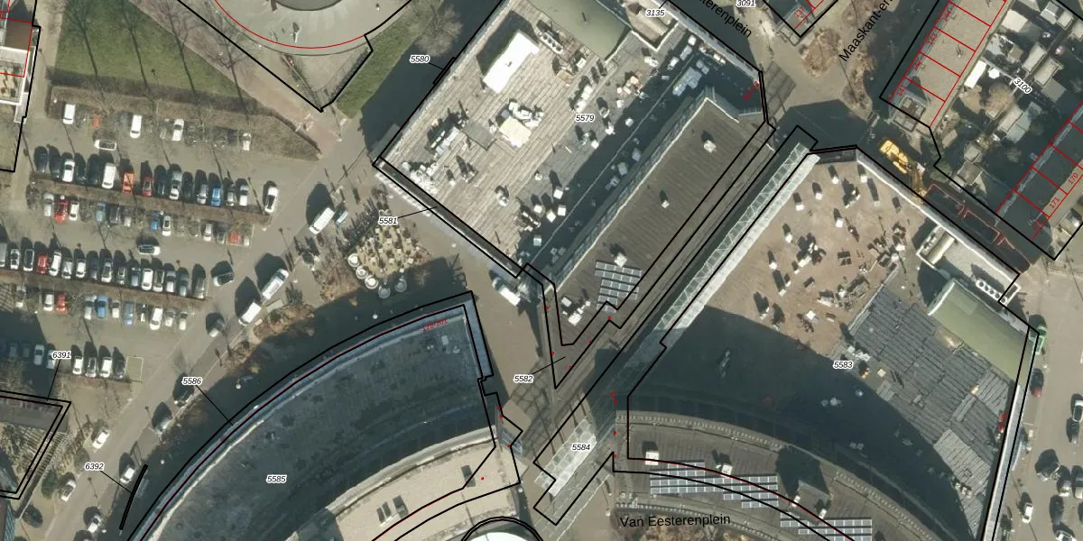 Het perceel waarop Van Eesterenplein 113 staat heeft een oppervlakte van 2850 m². Dit is een zeer groot perceel. De perceeloppervlakte wordt geregistreerd door het Kadaster. Gedetailleerde informatie over de maten van dit perceel kunt u vinden in het rapport Kadastrale kaart met maatvoering van Van Eesterenplein 113.