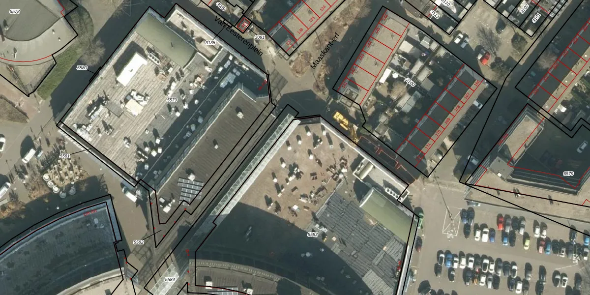 Het perceel waarop Van Eesterenplein 93 staat heeft een oppervlakte van 3740 m². Dit is een zeer groot perceel. De perceeloppervlakte wordt geregistreerd door het Kadaster. Gedetailleerde informatie over de maten van dit perceel kunt u vinden in het rapport Kadastrale kaart met maatvoering van Van Eesterenplein 93.