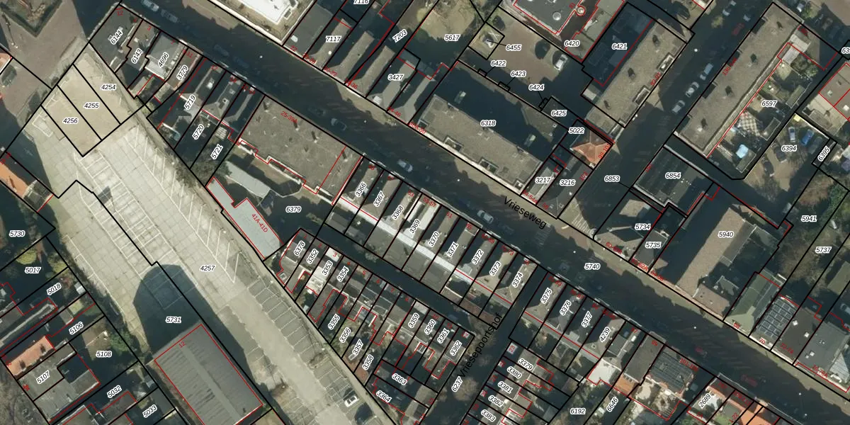 Het perceel waarop Vrieseweg 55 staat heeft een oppervlakte van 96 m². Dit is een klein perceel. De perceeloppervlakte wordt geregistreerd door het Kadaster. Gedetailleerde informatie over de maten van dit perceel kunt u vinden in het rapport Kadastrale kaart met maatvoering van Vrieseweg 55.