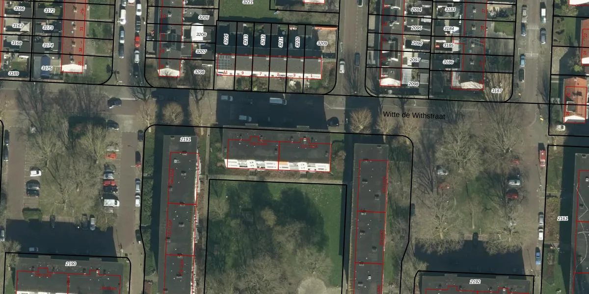 Het perceel waarop Witte de Withstraat 124 staat heeft een oppervlakte van 3565 m². Dit is een zeer groot perceel. De perceeloppervlakte wordt geregistreerd door het Kadaster. Gedetailleerde informatie over de maten van dit perceel kunt u vinden in het rapport Kadastrale kaart met maatvoering van Witte de Withstraat 124.