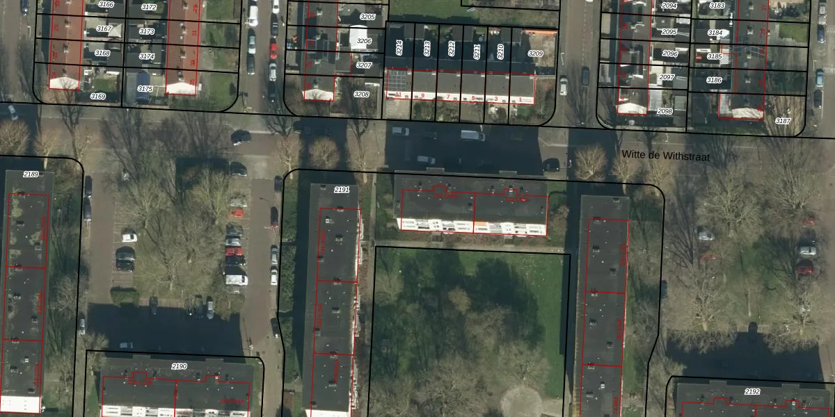 Het perceel waarop Witte de Withstraat 144-A staat heeft een oppervlakte van 3565 m². Dit is een zeer groot perceel. De perceeloppervlakte wordt geregistreerd door het Kadaster. Gedetailleerde informatie over de maten van dit perceel kunt u vinden in het rapport Kadastrale kaart met maatvoering van Witte de Withstraat 144-A.