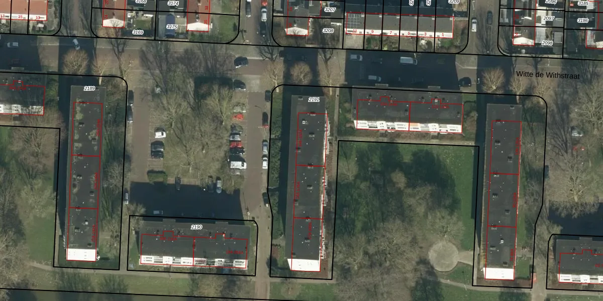 Het perceel waarop Witte de Withstraat 148 staat heeft een oppervlakte van 3565 m². Dit is een zeer groot perceel. De perceeloppervlakte wordt geregistreerd door het Kadaster. Gedetailleerde informatie over de maten van dit perceel kunt u vinden in het rapport Kadastrale kaart met maatvoering van Witte de Withstraat 148.