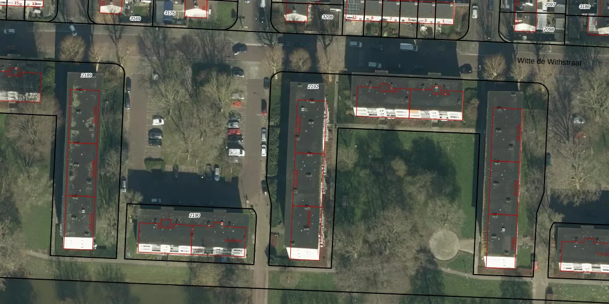 Het perceel waarop Witte de Withstraat 152 staat heeft een oppervlakte van 3565 m². Dit is een zeer groot perceel. De perceeloppervlakte wordt geregistreerd door het Kadaster. Gedetailleerde informatie over de maten van dit perceel kunt u vinden in het rapport Kadastrale kaart met maatvoering van Witte de Withstraat 152.