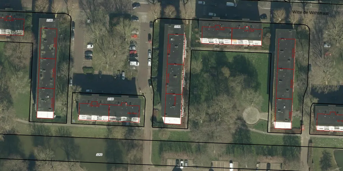 Het perceel waarop Witte de Withstraat 170 staat heeft een oppervlakte van 3565 m². Dit is een zeer groot perceel. De perceeloppervlakte wordt geregistreerd door het Kadaster. Gedetailleerde informatie over de maten van dit perceel kunt u vinden in het rapport Kadastrale kaart met maatvoering van Witte de Withstraat 170.