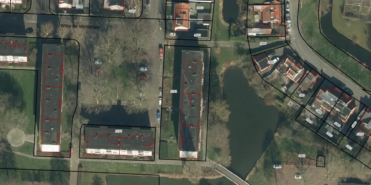 Het perceel waarop Witte de Withstraat 2 staat heeft een oppervlakte van 1545 m². Dit is een zeer groot perceel. De perceeloppervlakte wordt geregistreerd door het Kadaster. Gedetailleerde informatie over de maten van dit perceel kunt u vinden in het rapport Kadastrale kaart met maatvoering van Witte de Withstraat 2.