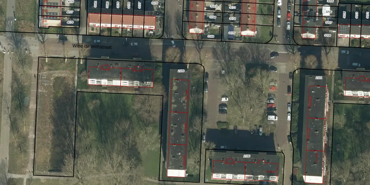 Het perceel waarop Witte de Withstraat 260 staat heeft een oppervlakte van 3590 m². Dit is een zeer groot perceel. De perceeloppervlakte wordt geregistreerd door het Kadaster. Gedetailleerde informatie over de maten van dit perceel kunt u vinden in het rapport Kadastrale kaart met maatvoering van Witte de Withstraat 260.