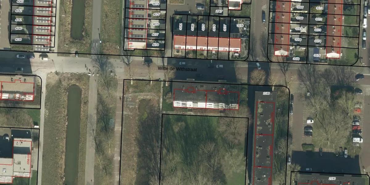 Het perceel waarop Witte de Withstraat 280 staat heeft een oppervlakte van 3590 m². Dit is een zeer groot perceel. De perceeloppervlakte wordt geregistreerd door het Kadaster. Gedetailleerde informatie over de maten van dit perceel kunt u vinden in het rapport Kadastrale kaart met maatvoering van Witte de Withstraat 280.
