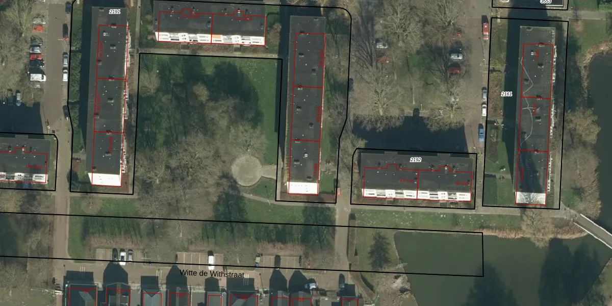 Het perceel waarop Witte de Withstraat 88-A staat heeft een oppervlakte van 3565 m². Dit is een zeer groot perceel. De perceeloppervlakte wordt geregistreerd door het Kadaster. Gedetailleerde informatie over de maten van dit perceel kunt u vinden in het rapport Kadastrale kaart met maatvoering van Witte de Withstraat 88-A.