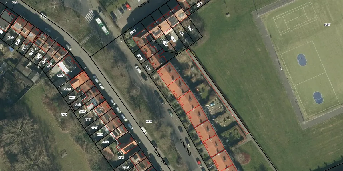Het perceel waarop Zuidendijk 100 staat heeft een oppervlakte van 8580 m². Dit is een zeer groot perceel. De perceeloppervlakte wordt geregistreerd door het Kadaster. Gedetailleerde informatie over de maten van dit perceel kunt u vinden in het rapport Kadastrale kaart met maatvoering van Zuidendijk 100.