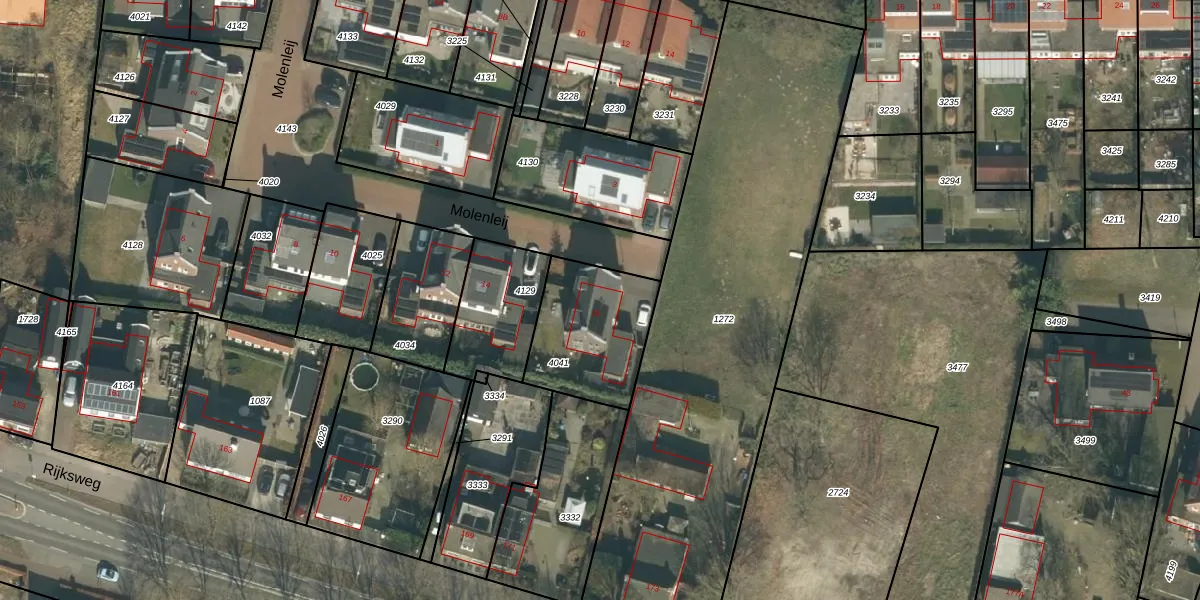 Het perceel waarop Molenleij 16 staat heeft een oppervlakte van 407 m². Dit is een groot perceel. De perceeloppervlakte wordt geregistreerd door het Kadaster. Gedetailleerde informatie over de maten van dit perceel kunt u vinden in het rapport Kadastrale kaart met maatvoering van Molenleij 16.