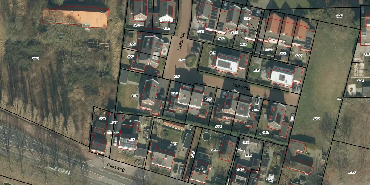 Het perceel waarop Molenleij 8 staat heeft een oppervlakte van 273 m². Dit is een middelgroot perceel. De perceeloppervlakte wordt geregistreerd door het Kadaster. Gedetailleerde informatie over de maten van dit perceel kunt u vinden in het rapport Kadastrale kaart met maatvoering van Molenleij 8.