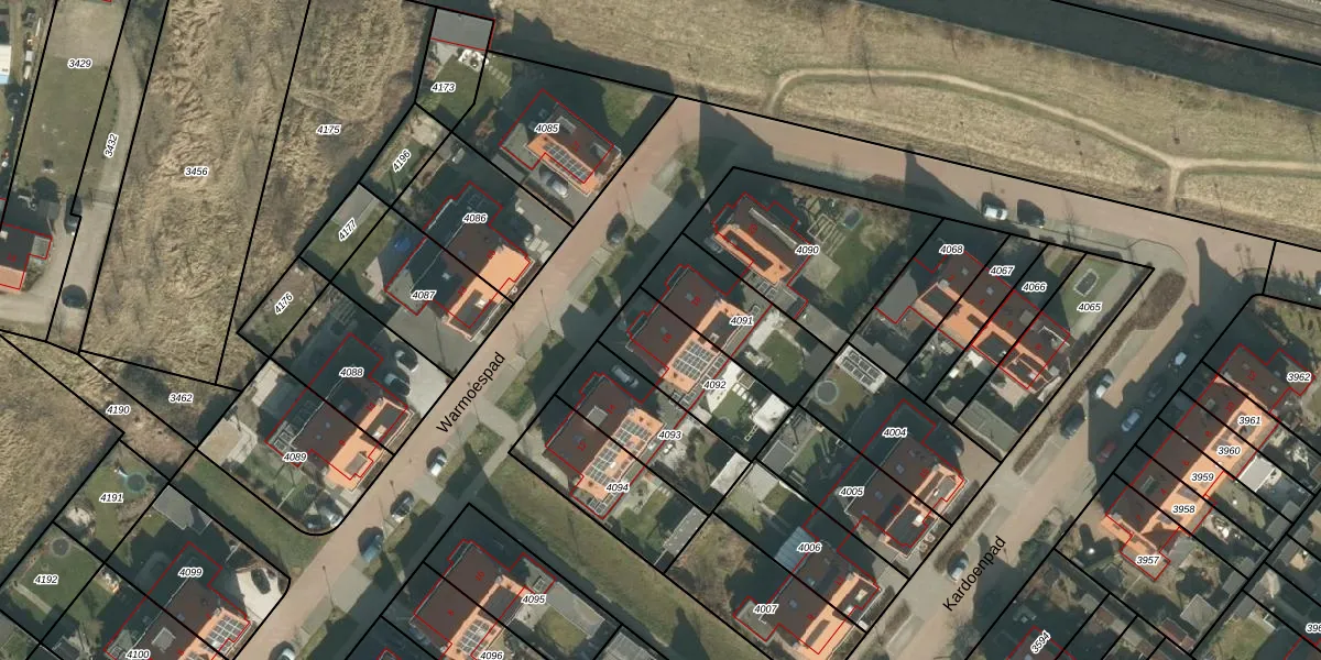 Het perceel waarop Warmoespad 16 staat heeft een oppervlakte van 310 m². Dit is een groot perceel. De perceeloppervlakte wordt geregistreerd door het Kadaster. Gedetailleerde informatie over de maten van dit perceel kunt u vinden in het rapport Kadastrale kaart met maatvoering van Warmoespad 16.