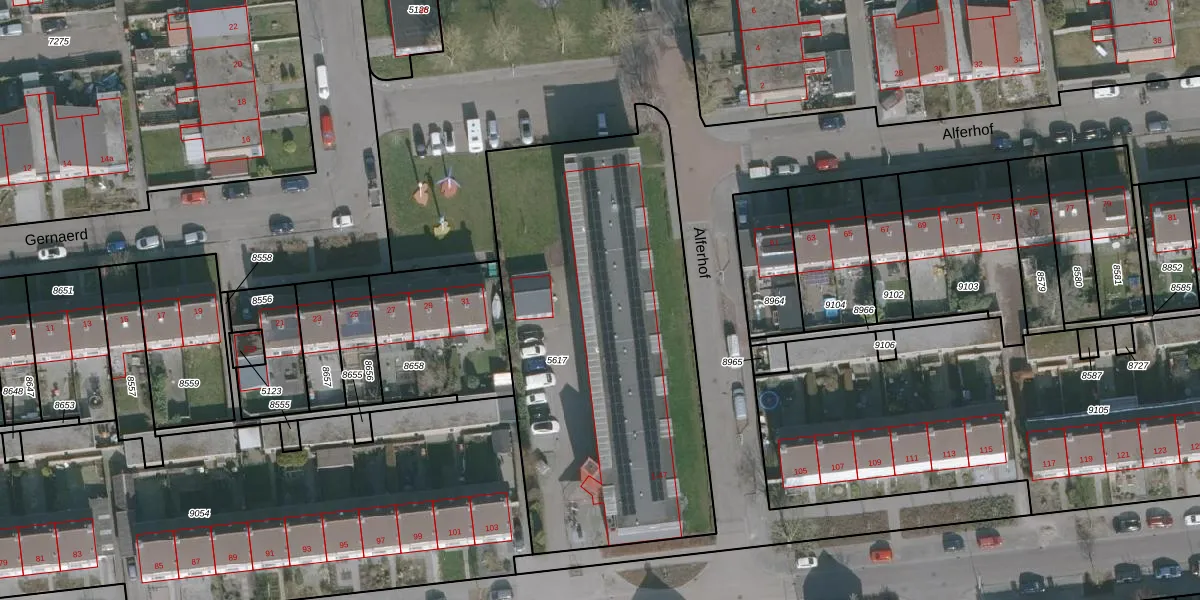 Het perceel waarop Alferhof 39 staat heeft een oppervlakte van 2109 m². Dit is een zeer groot perceel. De perceeloppervlakte wordt geregistreerd door het Kadaster. Gedetailleerde informatie over de maten van dit perceel kunt u vinden in het rapport Kadastrale kaart met maatvoering van Alferhof 39.