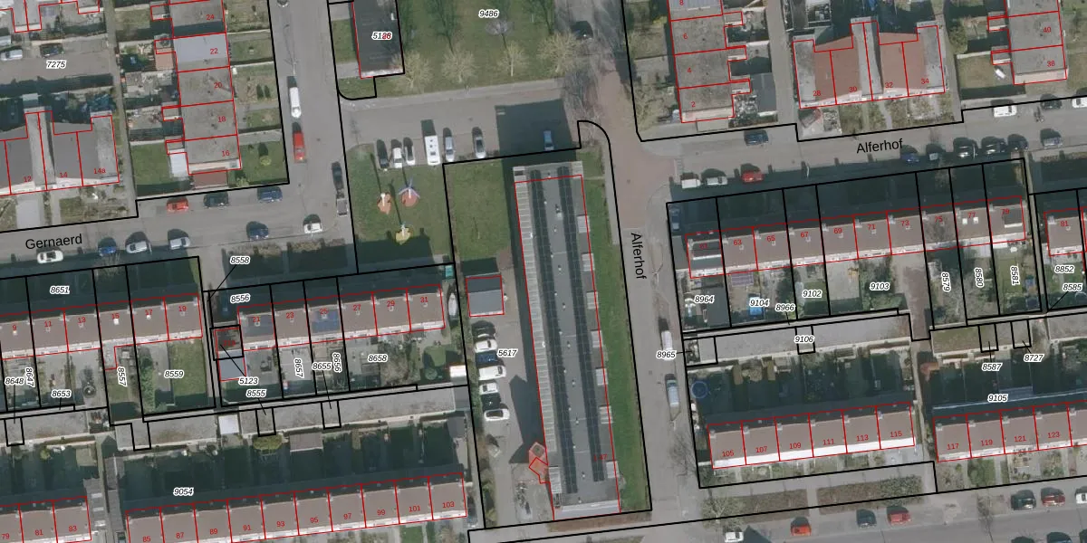 Het perceel waarop Alferhof 41 staat heeft een oppervlakte van 2109 m². Dit is een zeer groot perceel. De perceeloppervlakte wordt geregistreerd door het Kadaster. Gedetailleerde informatie over de maten van dit perceel kunt u vinden in het rapport Kadastrale kaart met maatvoering van Alferhof 41.