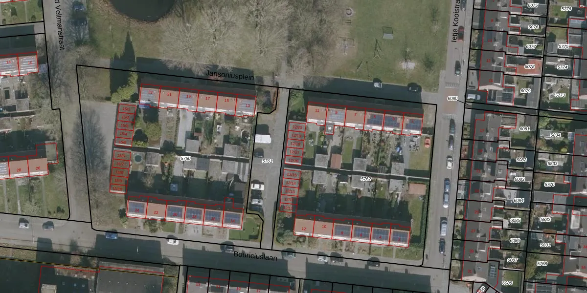 Het perceel waarop Bouriciuslaan 12-18 staat heeft een oppervlakte van 2832 m². Dit is een zeer groot perceel. De perceeloppervlakte wordt geregistreerd door het Kadaster. Gedetailleerde informatie over de maten van dit perceel kunt u vinden in het rapport Kadastrale kaart met maatvoering van Bouriciuslaan 12-18.