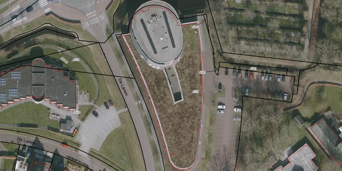Het perceel waarop De Lanen 35 staat heeft een oppervlakte van 5840 m². Dit is een zeer groot perceel. De perceeloppervlakte wordt geregistreerd door het Kadaster. Gedetailleerde informatie over de maten van dit perceel kunt u vinden in het rapport Kadastrale kaart met maatvoering van De Lanen 35.