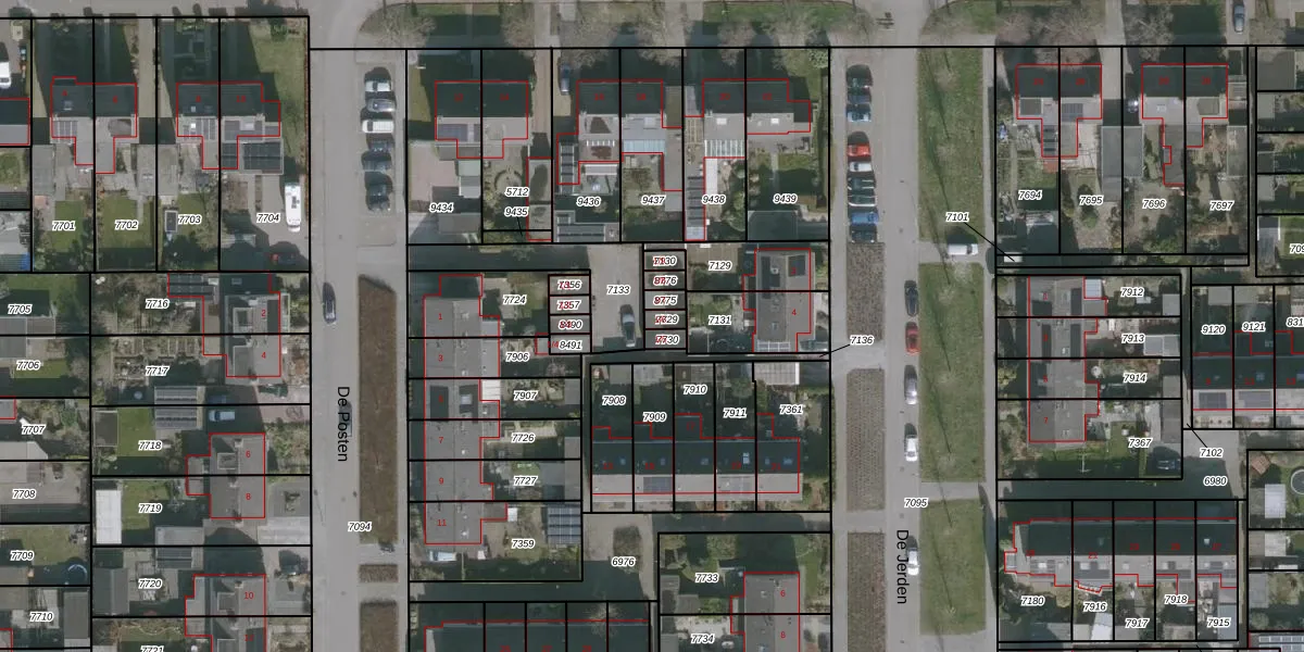 Het perceel waarop De Posten 1-6 staat heeft een oppervlakte van 19 m². Dit is een klein perceel. De perceeloppervlakte wordt geregistreerd door het Kadaster. Gedetailleerde informatie over de maten van dit perceel kunt u vinden in het rapport Kadastrale kaart met maatvoering van De Posten 1-6.