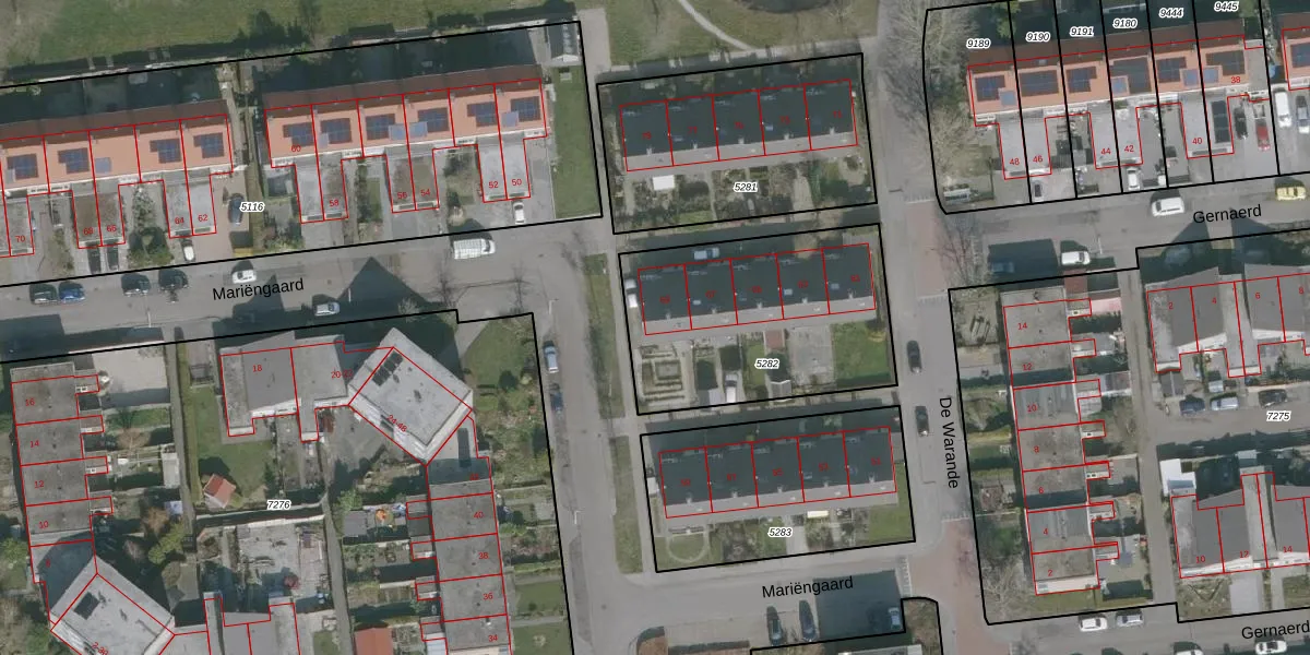 Het perceel waarop De Warande 69 staat heeft een oppervlakte van 995 m². Dit is een groot perceel. De perceeloppervlakte wordt geregistreerd door het Kadaster. Gedetailleerde informatie over de maten van dit perceel kunt u vinden in het rapport Kadastrale kaart met maatvoering van De Warande 69.