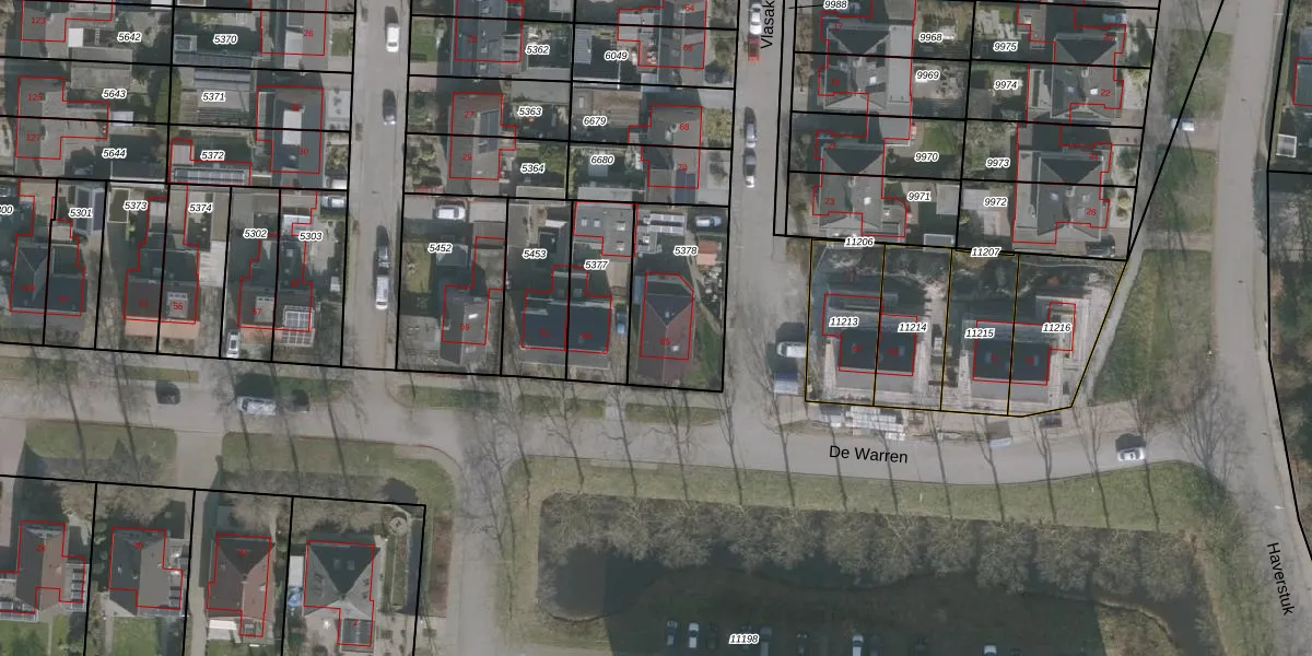 Het perceel waarop De Warren 65 staat heeft een oppervlakte van 411 m². Dit is een groot perceel. De perceeloppervlakte wordt geregistreerd door het Kadaster. Gedetailleerde informatie over de maten van dit perceel kunt u vinden in het rapport Kadastrale kaart met maatvoering van De Warren 65.