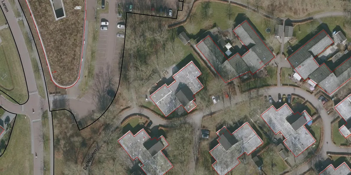Het perceel waarop De Wouden 1 staat heeft een oppervlakte van 5,4 ha. Dit is een zeer groot perceel. De perceeloppervlakte wordt geregistreerd door het Kadaster. Gedetailleerde informatie over de maten van dit perceel kunt u vinden in het rapport Kadastrale kaart met maatvoering van De Wouden 1.