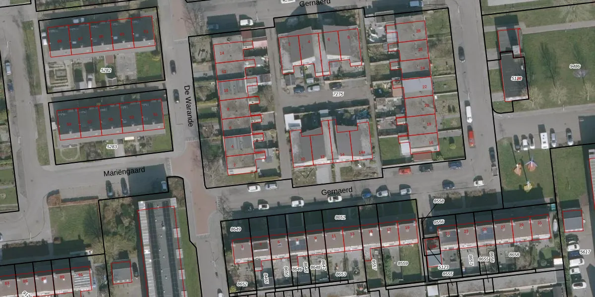 Het perceel waarop Gernaerd 10 staat heeft een oppervlakte van 4653 m². Dit is een zeer groot perceel. De perceeloppervlakte wordt geregistreerd door het Kadaster. Gedetailleerde informatie over de maten van dit perceel kunt u vinden in het rapport Kadastrale kaart met maatvoering van Gernaerd 10.