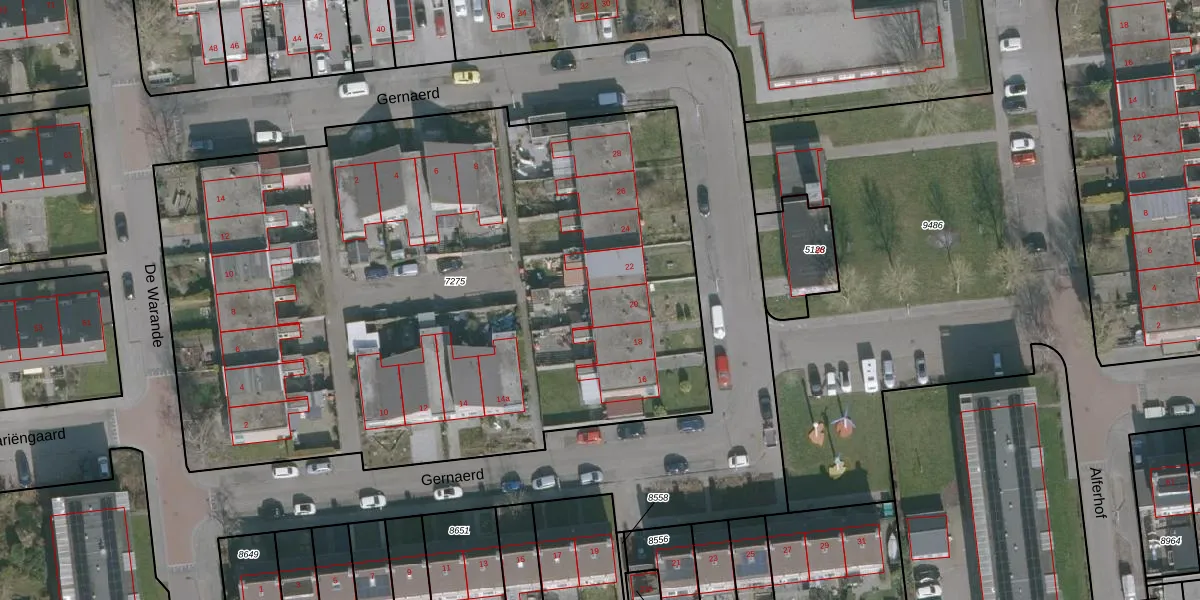 Het perceel waarop Gernaerd 20 staat heeft een oppervlakte van 4653 m². Dit is een zeer groot perceel. De perceeloppervlakte wordt geregistreerd door het Kadaster. Gedetailleerde informatie over de maten van dit perceel kunt u vinden in het rapport Kadastrale kaart met maatvoering van Gernaerd 20.