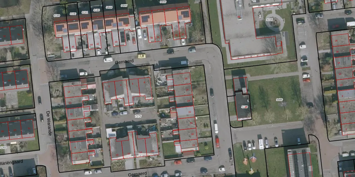Het perceel waarop Gernaerd 26 staat heeft een oppervlakte van 4653 m². Dit is een zeer groot perceel. De perceeloppervlakte wordt geregistreerd door het Kadaster. Gedetailleerde informatie over de maten van dit perceel kunt u vinden in het rapport Kadastrale kaart met maatvoering van Gernaerd 26.